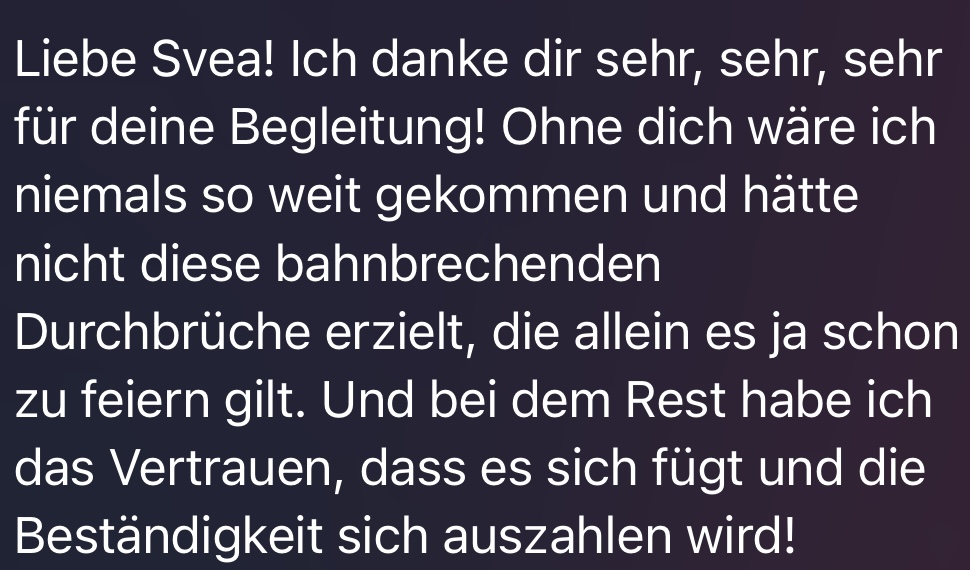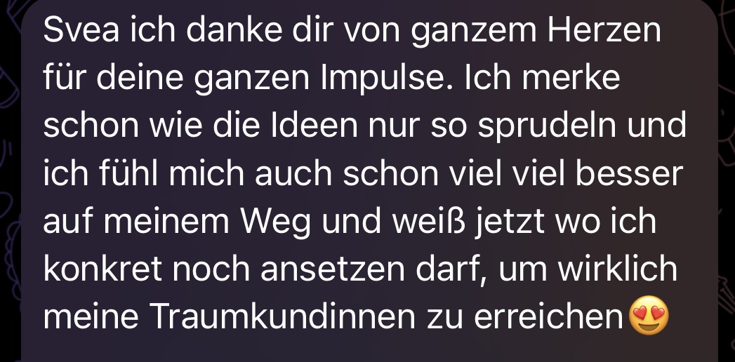 Ich bin so glücklich, dass ich Svea gefunden habe. Ich habe schon viel Geld in andere Coaches investiert. Niemand hat so on Point erkannt, wo meine Blockaden liegen wie Svea. Das Coaching hat mich darin bestärkt meinen Träumen zu folgen und endlich den Mut zu finden, sie umzusetzen. Du bekommst bei Svea keine 0815 Strategie, sondern Klarheit darüber was DEIN Weg ist und was sich für dich richtig anfühlt.